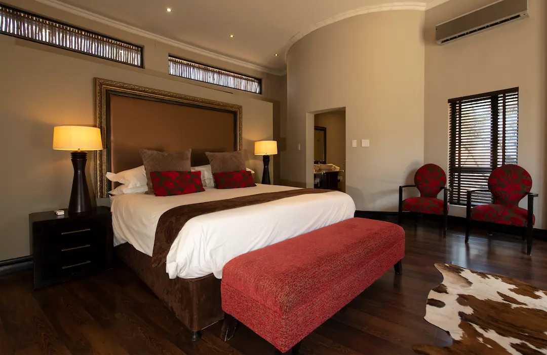 Each room features plush beds with crisp white linens, ensuring a restful night under the African sky.